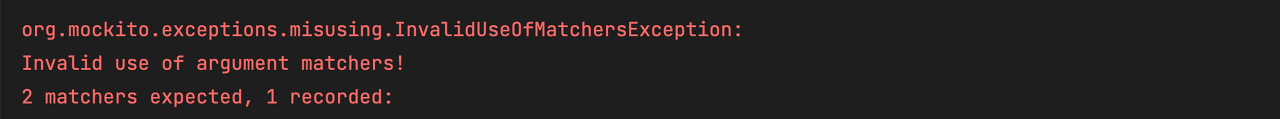 이렇게 InvalidUseOfMatchersException 이 생기는 것을 확인할 수 있다. 왜 이런 예외가 발생한 것일까?