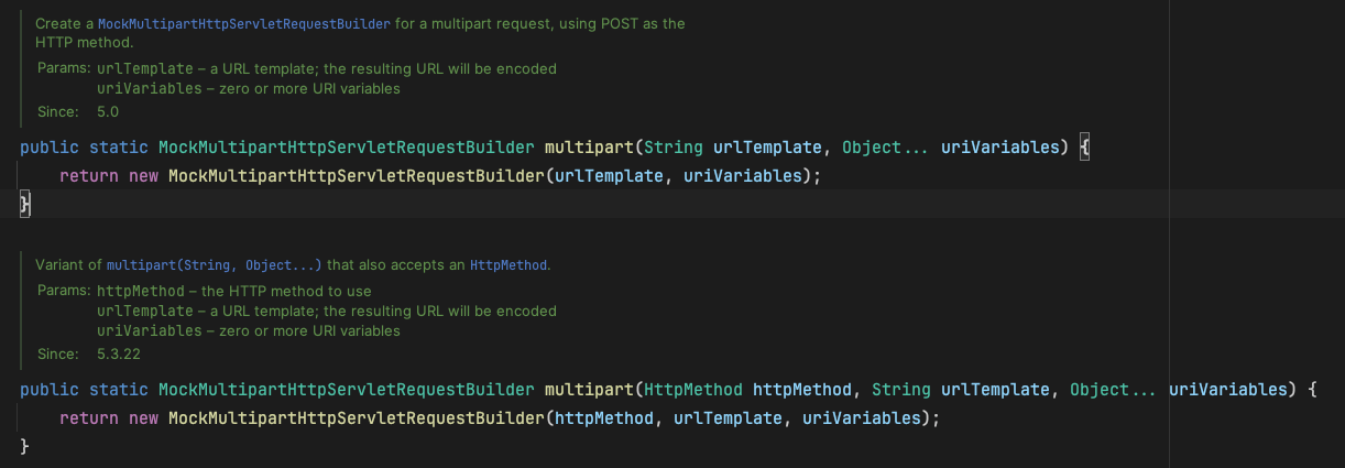 그런데 다시 MockMvcRequestBuilders 클래스로 돌아가보면, 해당 클래스는 위에서 확인했던 multipart() 메서드 뿐만 아니라, HttpMethod를 매개변수로 전달받는 오버로딩된 다른 multipart() 메서드도 존재하는 것을 볼 수 있다.