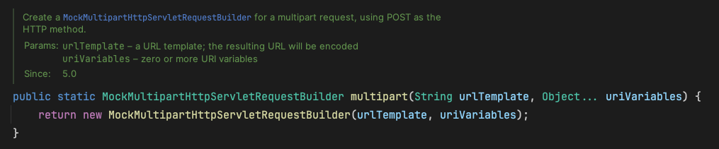 사실, 위의 테스트 코드에서 사용한 multipart() 메서드는 Spring RestDocs에서 제공하는 RestDocumentationRequestBuilders의 메서드이며, 테스트와 동시에 API 문서화도 함께 적용하기 위하여 사용했다. 해당 메서드를 더 자세히 살펴보자.