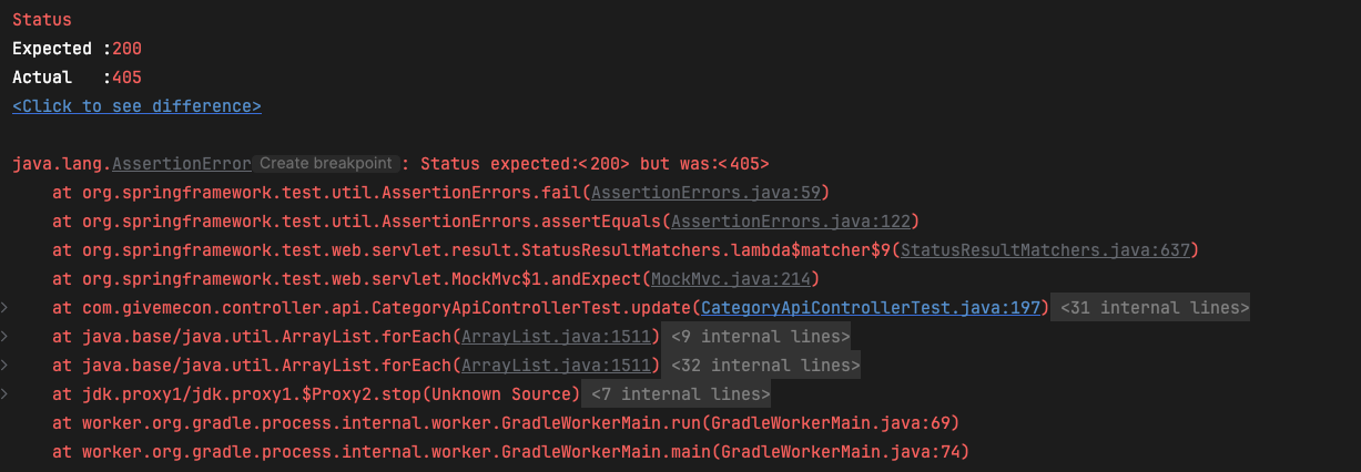 그리고 API 테스트하기 위해 위와 같이 테스트 코드를 작성했다. 200 OK 상태를 전달하며 테스트가 성공할 것이라고 예상했던 것과 달리, 아래와 같은 메시지와 함께 테스트에 실패했다.