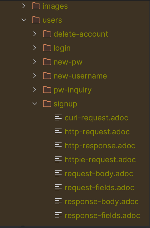 을 설정하고 테스트를 실행하여 통과하면 아래와 같이 build/generated-snippets 에 request-fields.adoc 과 response-fields.adoc 이 추가 된 것을 확인할 수 있다.